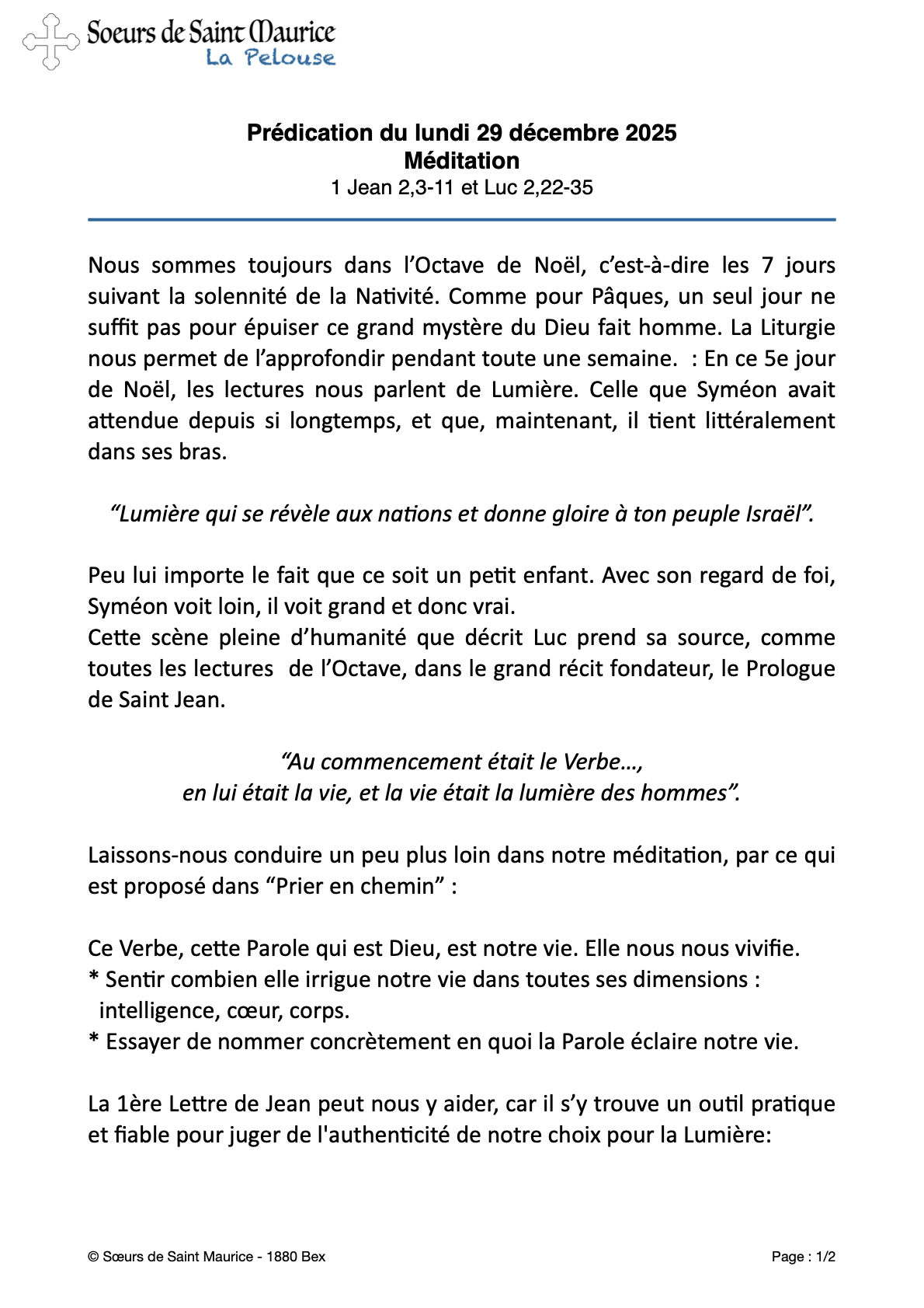 Méditation : 1 Jean 2,3-11 et Luc 2,22-35